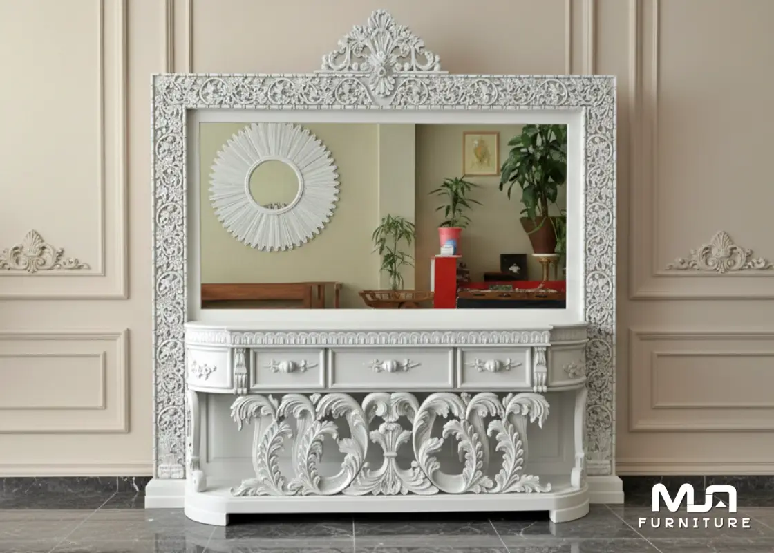 Console Bufet Cermin Mewah produk terbaru dari furniture asli jepara dengan model klasik modern ukiran ala eropa membuat bufet cermin ini di minati kalangan orang kaya karena harganya yang mahal tapi memuaskan bagi para pelanggan.