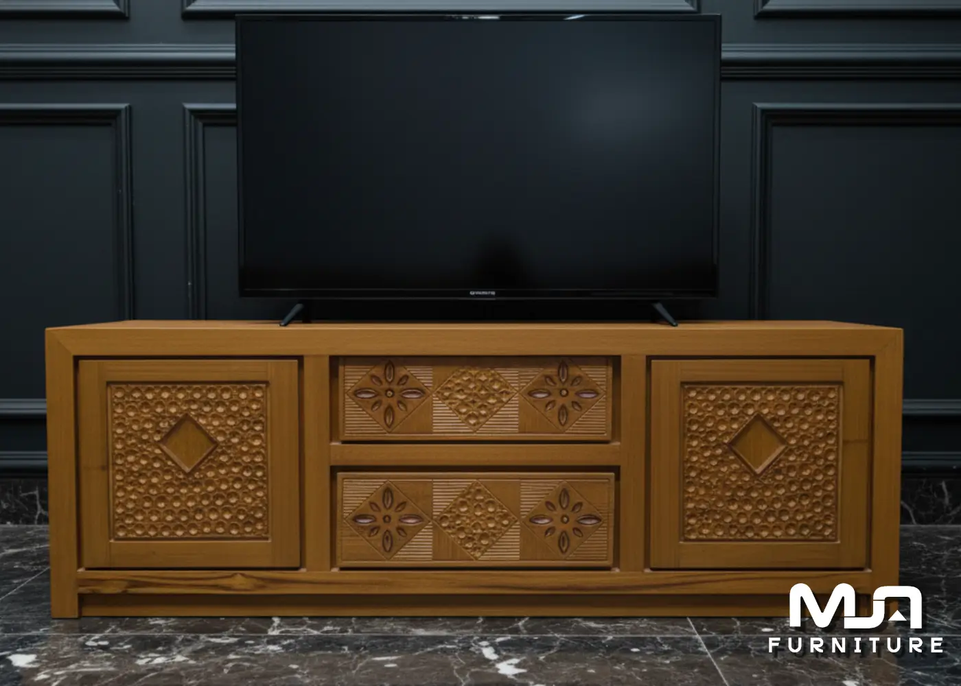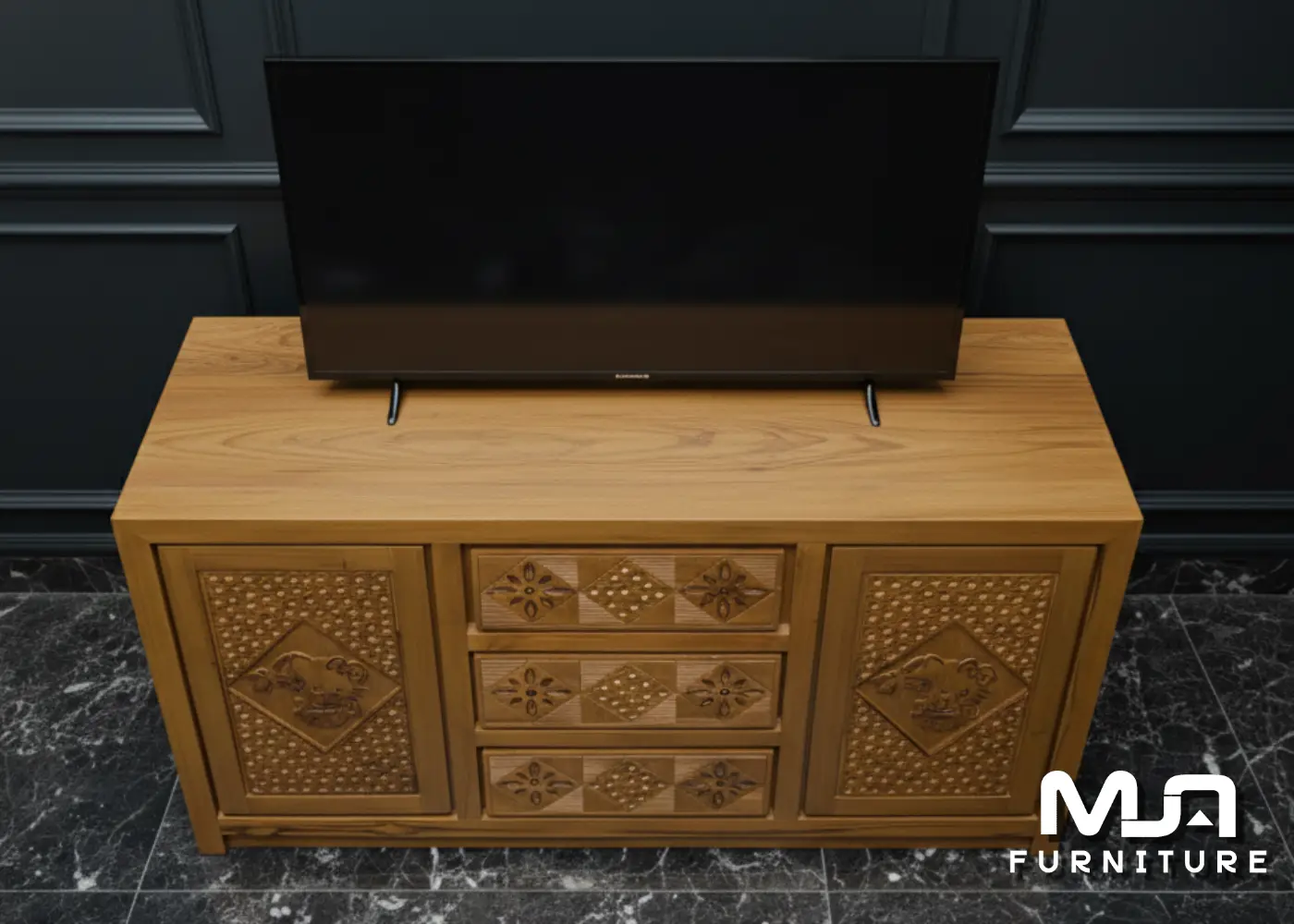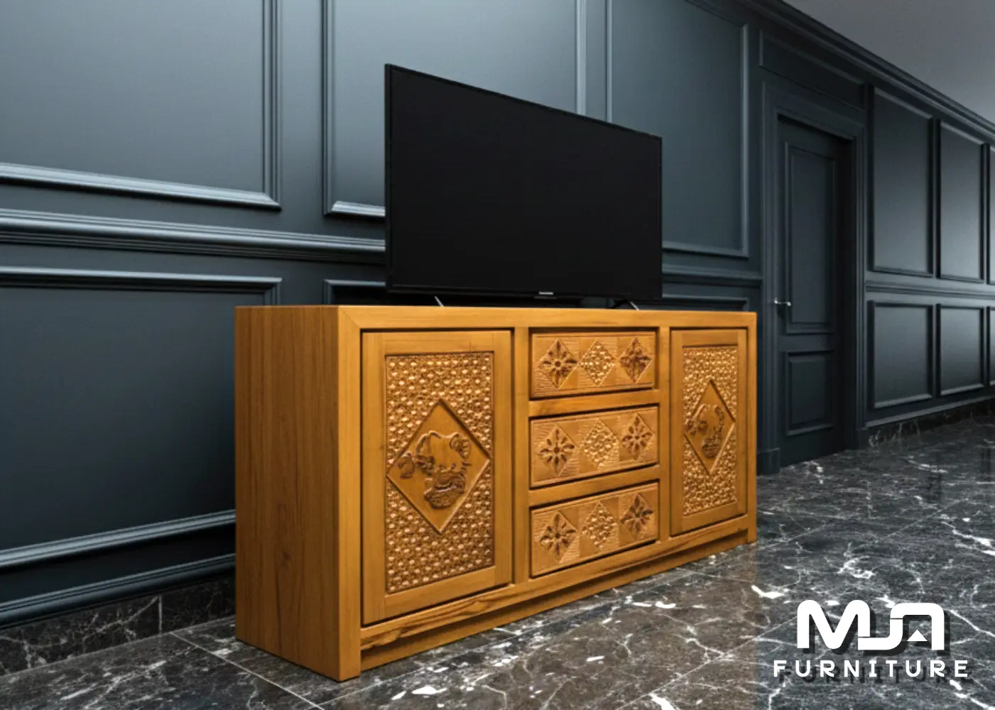 Bufet ini mengusung konsep minimalis salur dengan garis tegas dan proporsional. Finishing natural menonjolkan serat kayu jati asli, memberi kesan hangat sekaligus eksklusif. Cocok digunakan sebagai: