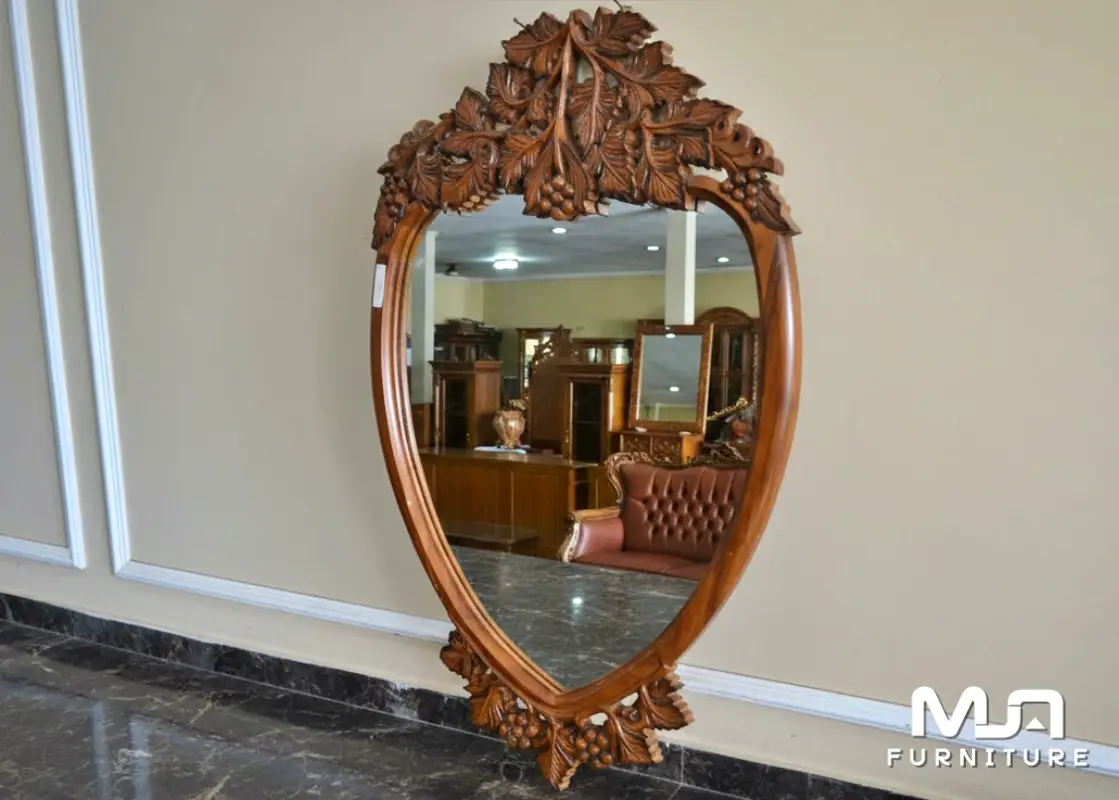 Berdesain klasik ukiran yang sangat elegant dengan lekukan lekukan kayu yang unik Cermin Hias Dinding Ukiran Anggur . Produk Cermin Hias Dinding ini dapat anda tempatkan diruangan yang mana bisa anda gunakan bercermin, tergantung kebutuhan dan penempatan yang pada ruangan yang pas. Ruangan rumah anda akan lebih cantik dan terasa lebih luas jika produk furniture Cermin Dinding ini sudah anda terapkan disana. Terbuat dengan menggunakan material kayu perhutani pilihan, produk terbaru kami ini dikerjakan dengan sangat terkontrol. Berikut spesifikasi Cermin Hias Dinding Ukiran Anggur yang elegant ini.