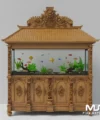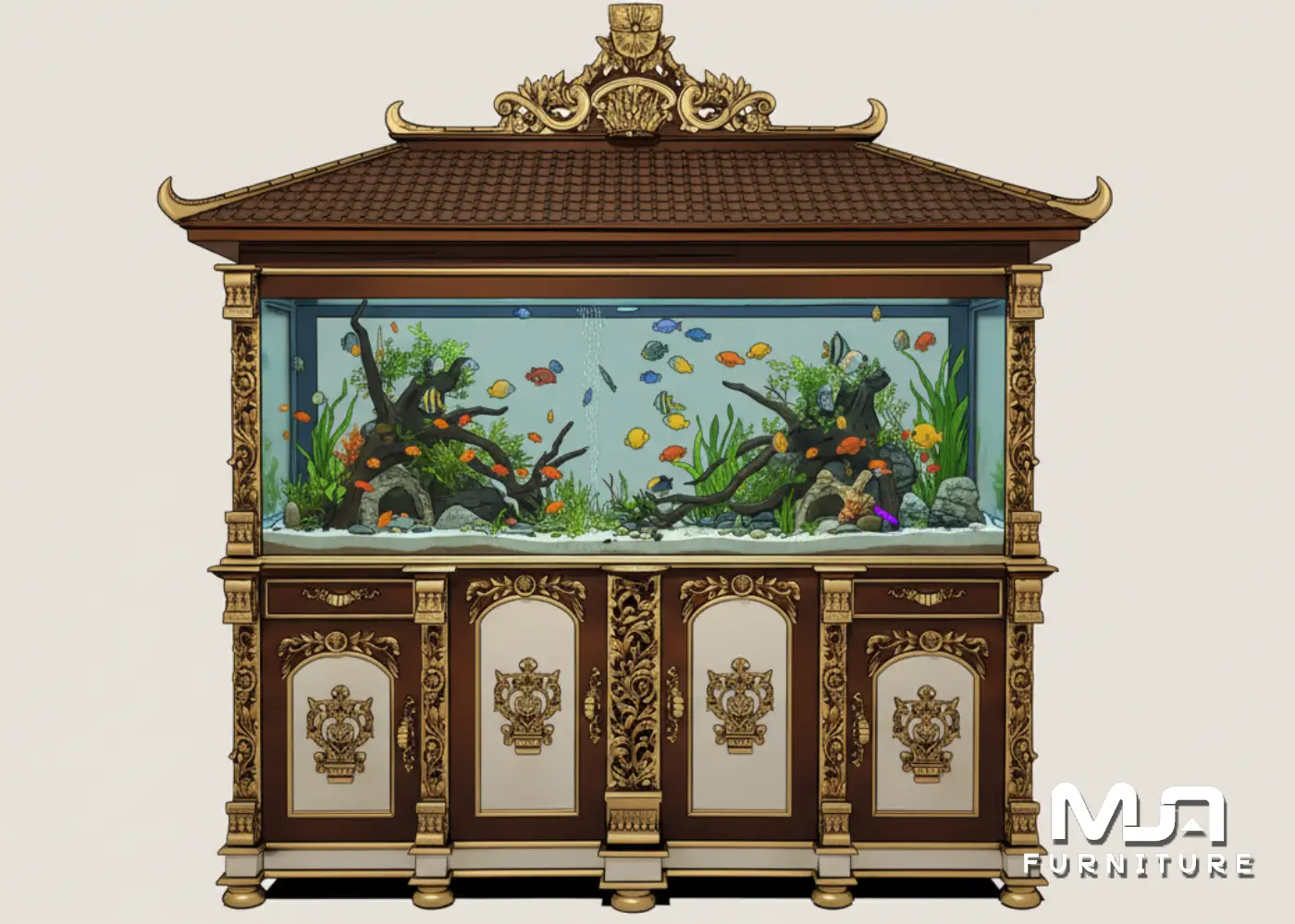 Kami Jual Meja Aquarium Ikan Hias Ukir Jati Mewah Jepara ini memiliki desain yang sangat detail dan megah, menyerupai gaya arsitektur tradisional atau oriental, lengkap dengan atap bergaya pagoda berwarna cokelat tua.