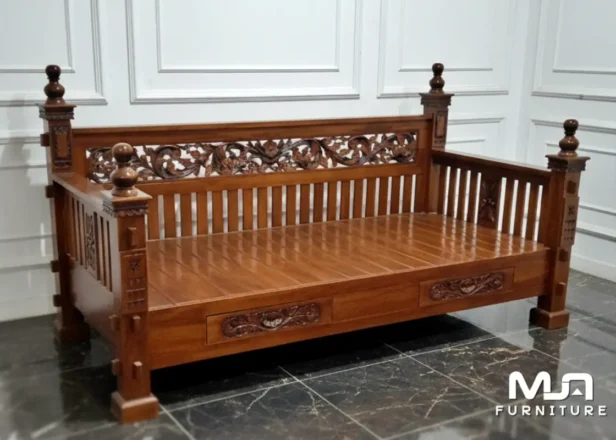 Bangku Bale Bale Gebyok Jati Klasik Daybed Mewah Bale Bale Gebyok ukuran 2m panjang dan lebar 80 cm, ada juga ukuran 2mx1m, jika anda menginginkan ukuran lain call/wa kontak kami di halaman depan website. Model bale bale ukiran mewah ini sangat elegan dengan ukiran khas jepara dan terbuat dari kayu jati yang solid dan sudah kering,…