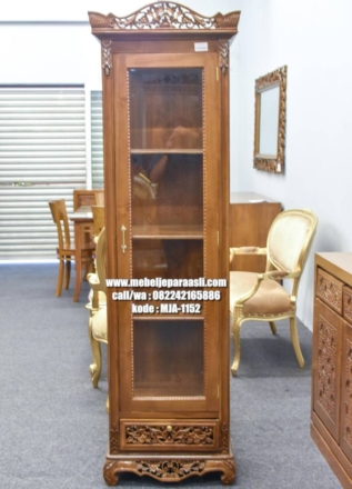 Lemari hias 1 pintu adalah sebuah lemari terbuat dari kayu jati yang dilengkapi dengan satu pintu dapat digunakan untuk menyimpan barang decoratif, seperti kerajinan tangan, bingkai foto, atau benda lainnya yang membutuhkan perlindungan dari debu dan serangga. Lemari hias 1 pintu memiliki sebuah rak, sebuah lantai, dan sebuah bingkai di lengkapi dengan kuci untuk mengaman…