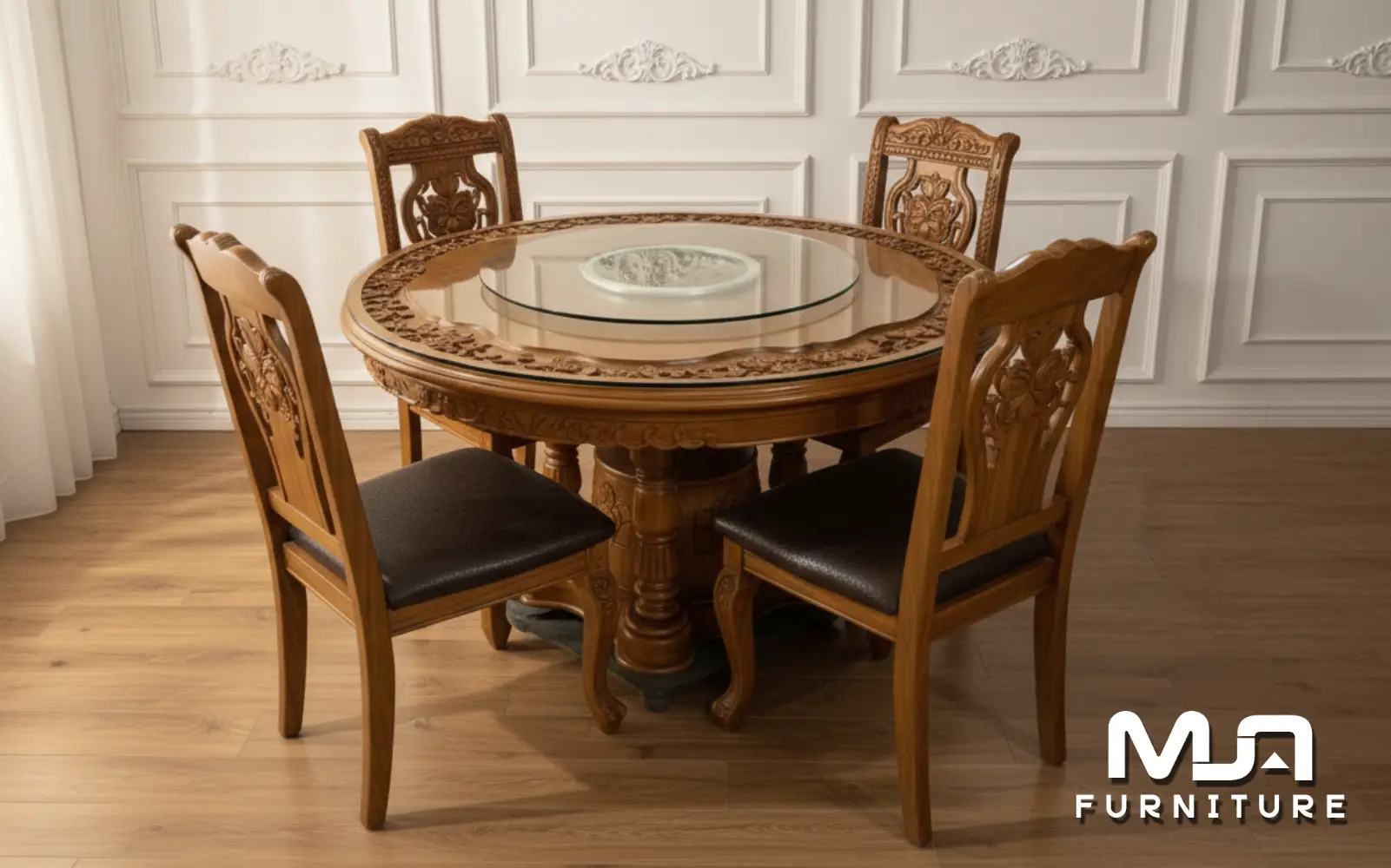 Meja Jati Ukir Mawar Model Bundar Set 4 Kursi