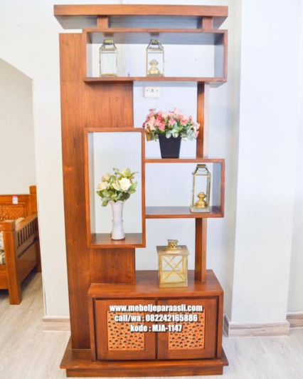 Partisi 1 Meter dibuat dari bahan jati yang kuat serta tahan lama. Lemari ini mempunyai banyak rak yang dapat dimanfaatkan selaku rak tempat memajang dekorasi- dekorasi rumah kesukaan kamu sehingga ruangan nampak lebih menarik. Lemari ini pula mempunyai banyak tempat- tempat penyimpanan tertutup bagian bawah dengan kapasitas besar. Tidak hanya berperan selaku tempat penyimpanan serta rak display, lemari ini pula bisa difungsikan selaku pembatas antara rumah bagian depan ataupun ruang tamu.